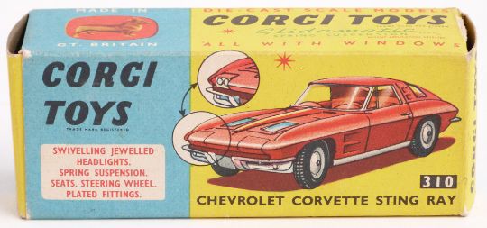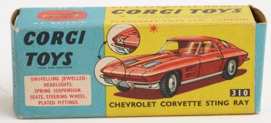 Corgi Toys diecast model Chevrolet Corvette Sting Ray with metallic red body and lemon interior, 310, in original box.