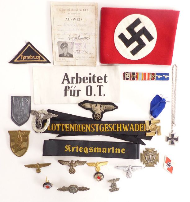 Replica Nazi German insignia and badges to include Luftwaffe, cap insignia, armband, medal bar etc