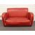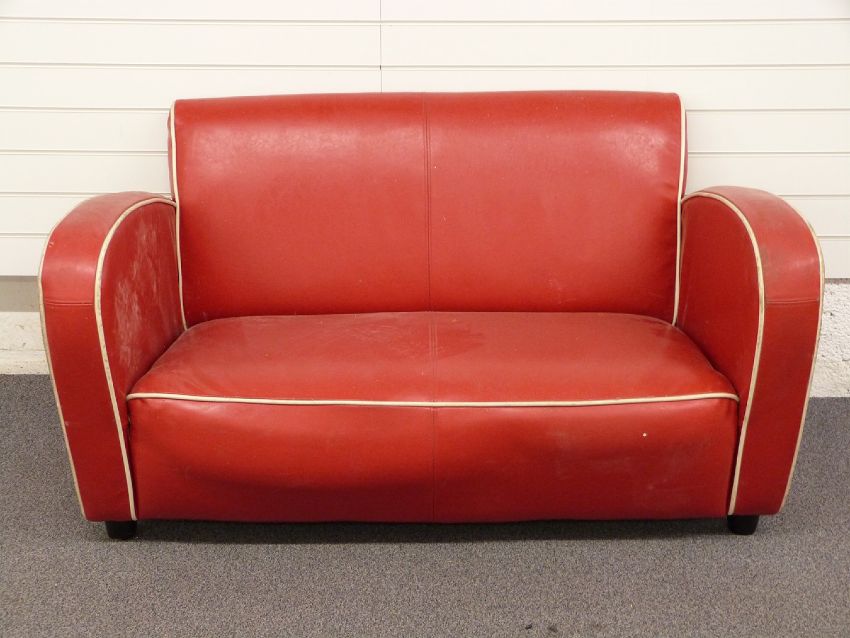 Art Deco/retro red faux leather sofa and footstool with cream piping detail, W141 x D85 x H78cm