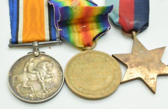 British Army WW1 medals comprising Victory Medal and War Medal, both named to 56118 Private J H Wallace, Devonshire Regiment and WW2 medals 1939-1945 Star, Africa Star, Italy Star, France & Germany Star and War Medal, together with copy of paperwork supplement to The London Gazette etc
