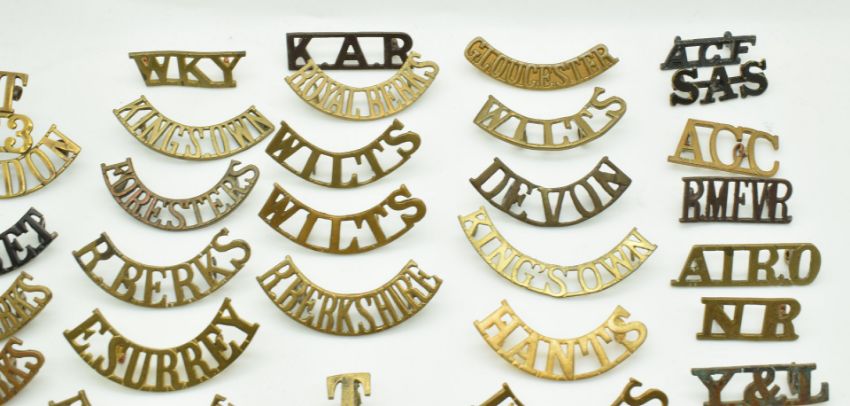British Army approximately fifty military metal shoulder titles including Royal Hampshire. East Surrey, Welsh etc