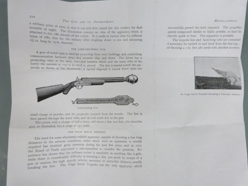 The Line Throwing Gun Company of Dundee No. 44 percussion hammer action line thrower with chequered semi-pistol grip and 16 inch octagonal barrel inscribed 'A No.44 The Line Throwing Gun Co. Limited Dundee', overall length 85cm, together with related information and diagram.