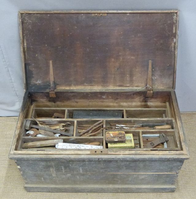 A 19thC pine toolbox with fitted sliding drawer, vintage woodworking tools including planes, woodcarving chisels, etc