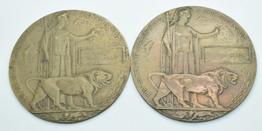 British Army two WW1 memorial plaques to two brothers - David Ward, 6th Battalion East Lancashire Regiment, died 16 January 1917, and Herbert Frank Ward, Machine Gun Corps, died 22 August 1918