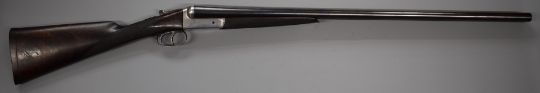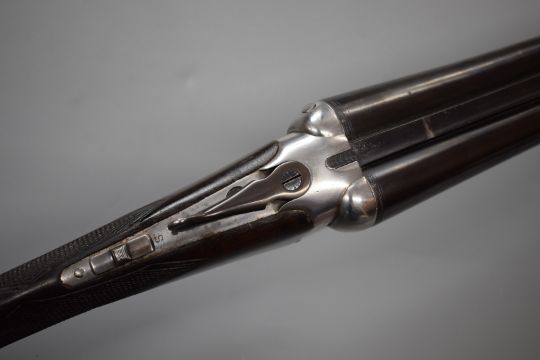 Moore & Grey 12 bore side by side ejector shotgun with named locks, chequered grip and forend, double trigger and 30 inch barrels choked ½ and improved cylinder and engraved 'Moore & Grey 8 Craven Street Strand London', overall length 117cm, length of pull 35.5cm, serial number 45013, in fitted canvas and leather case with original label. PLEASE NOTE THAT A VALID RELEVANT FIREARMS/SHOTGUN CERTIFICATE IS REQUIRED TO HANDLE/PURCHASE THIS ITEM.