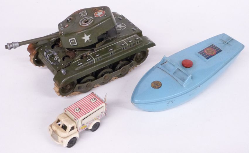 Three clockwork tinplate toys comprising GAMA tank, Sutcliffe boat and an ice cream van together with three Trix TTR 00 gauge wagons and coaches, two in original boxes