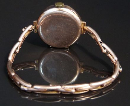 Buren 9ct gold ladies wristwatch with blued Breguet hands, black Arabic numerals, gilt minute markers, white enamel dial and signed 15 jewel movement, on 9ct gold expanding bracelet, case diameter 25mm, serial number 313098, 18.8g