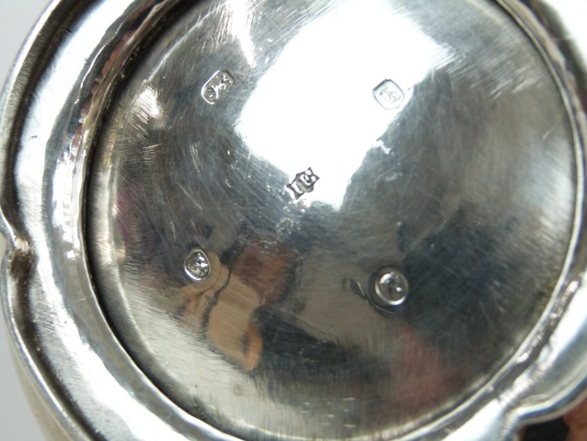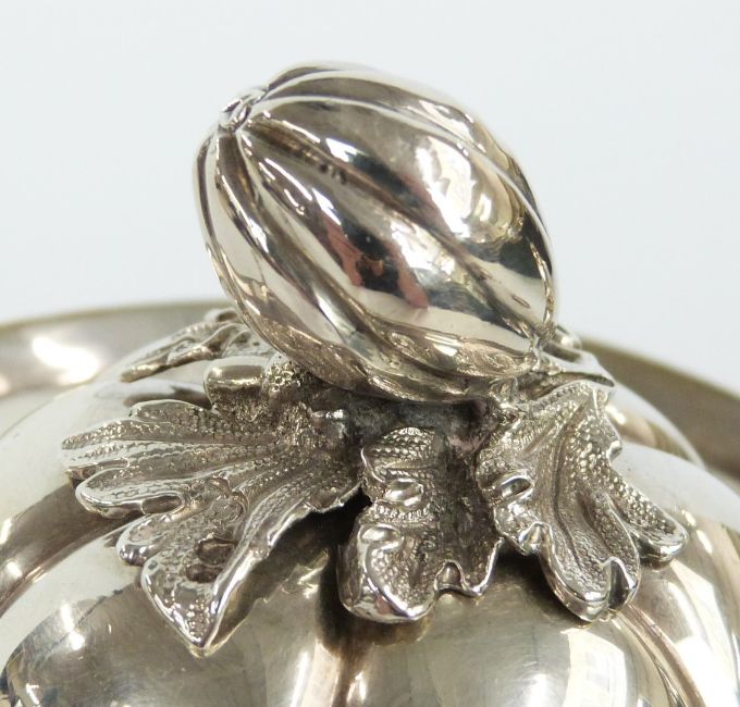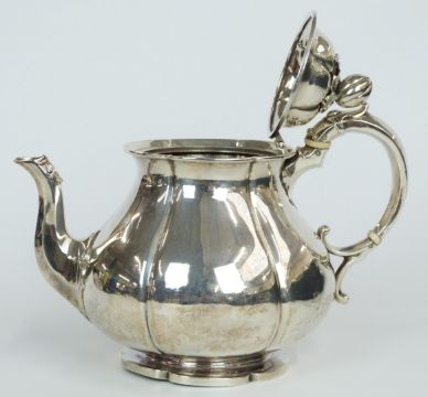 Victorian hallmarked silver teapot with lobed body and fruit finial, London 1843 maker John Eley, height 16.5cm, weight 687g all in