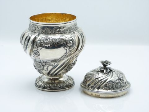 Edward VII hallmarked silver covered pedestal tea caddy with wrythen moulded and repoussé floral decoration, gilt wash interior, rope twist engine-turned rim and flower finial, London 1901 maker Hunt & Roskell, height 15.5cm, weight 302g