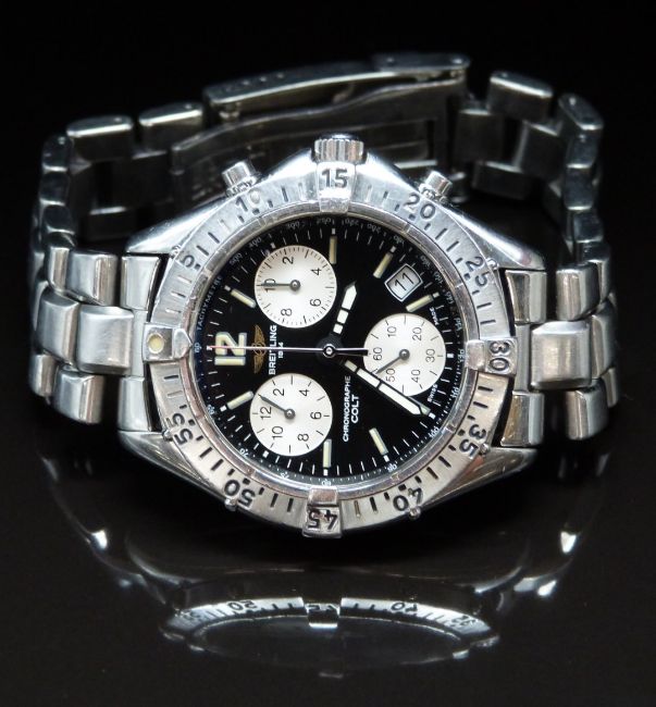 Breitling Colt gentleman's chronograph wristwatch ref. A53035 with date aperture, luminous hands and markers, silver subsidiary dials, black dial, unidirectional bezel and calibre 53 quartz movement, on stainless steel bracelet, case diameter 38mm, serial number 23636