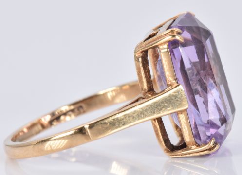 A 9ct gold ring set with a mixed emerald cut amethyst, 3.6g, size L