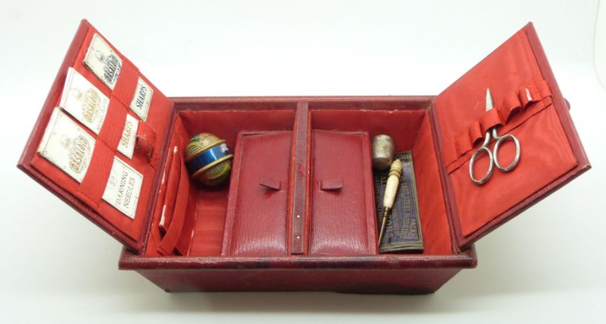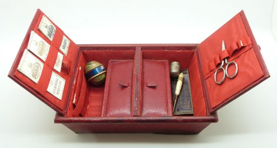 A late 19th/20thC sewing / needlework red Morocco leather workbox with fitted interior and accessories, W18 x D13 x H7cm