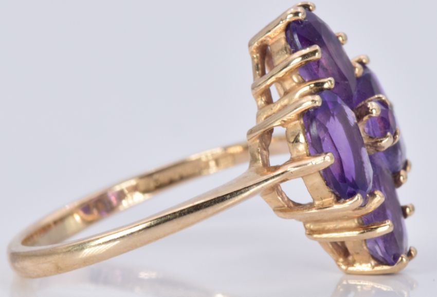A 9ct gold ring set with five amethysts in a cluster, 3.3g, size O