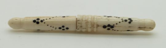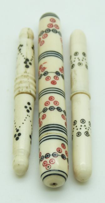 Three 19thC turned bone and ivory Indian Madras ware needle cases, longest 9cm