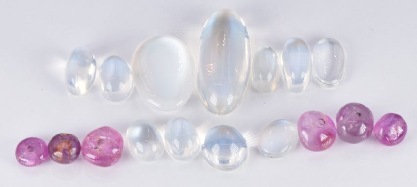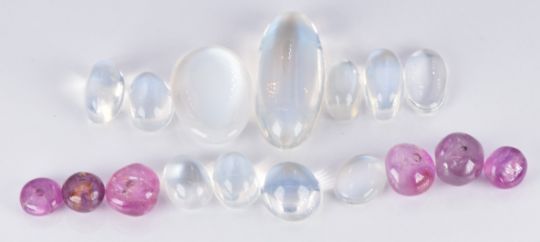 Eleven loose moonstone cabochons and six pink sapphire beads