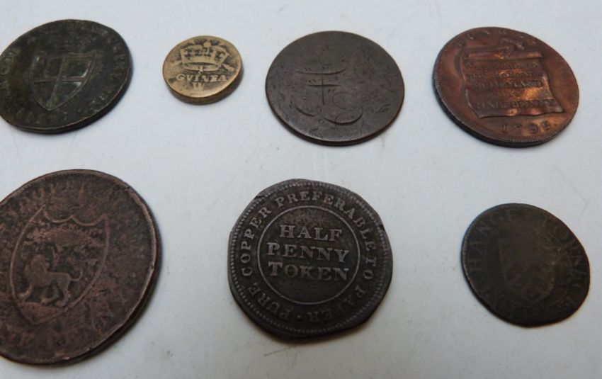 Five 18thC and early 19thC halfpenny tokens including St Helena and Newgate, together with a penny token, a Gloucester City 1657 halfpenny and a William III one guinea weight etc