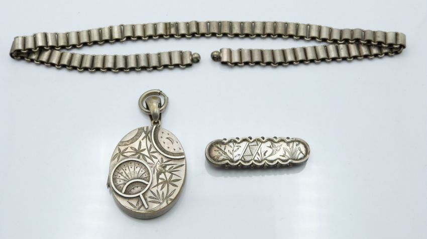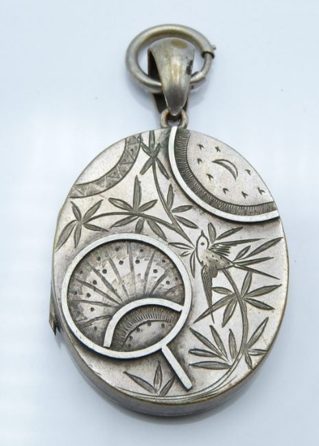Victorian locket with bird and foliate decoration and chain, and another Victorian brooch with similar decoration
