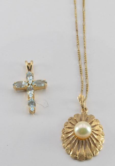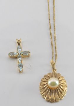 Two 9ct gold pendants, one set with a pearl and the other with aquamarines on a 9ct chain, 4.6g