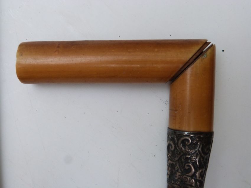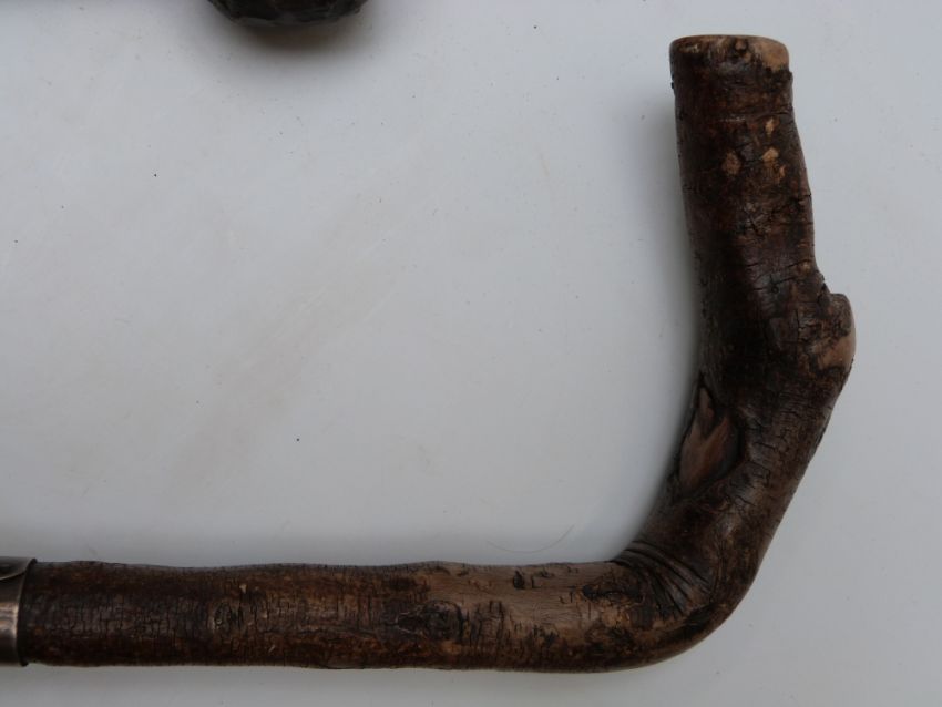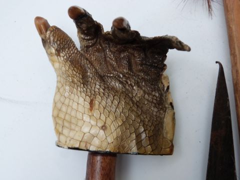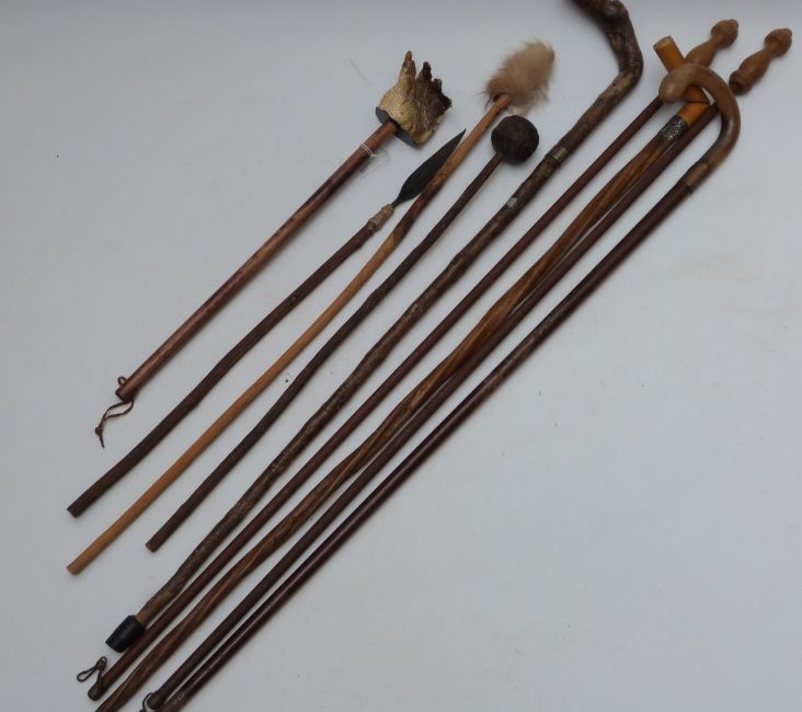 Collection of walking sticks including rhinoceros horn or similar with 9ct gold ferrule, London 1917, hallmarked silver mounted, knobkerrie type, crocodile claw, small spear etc