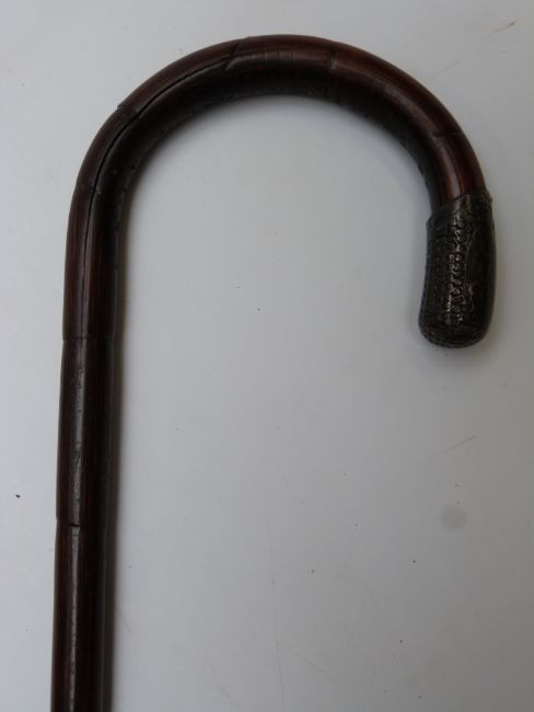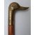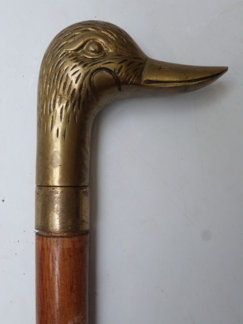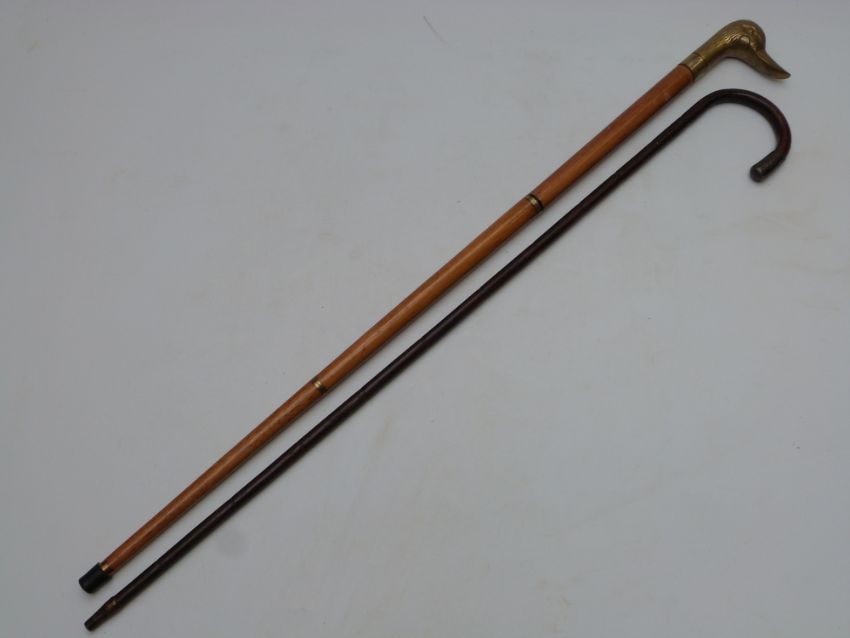 A walking cane with hallmarked silver mounts, London 1916, and a walking stick with brass duck head, screw top and drinking vessel or flask within, longest 90cm