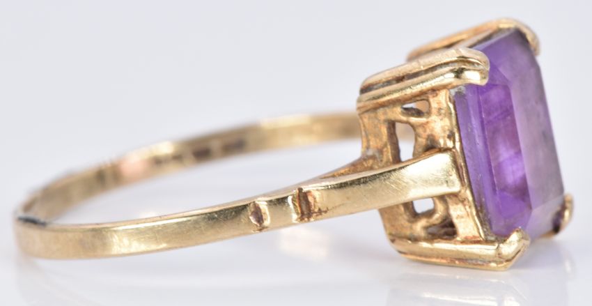 A 9ct gold ring set with an emerald cut amethyst, 2.4g, size N
