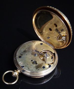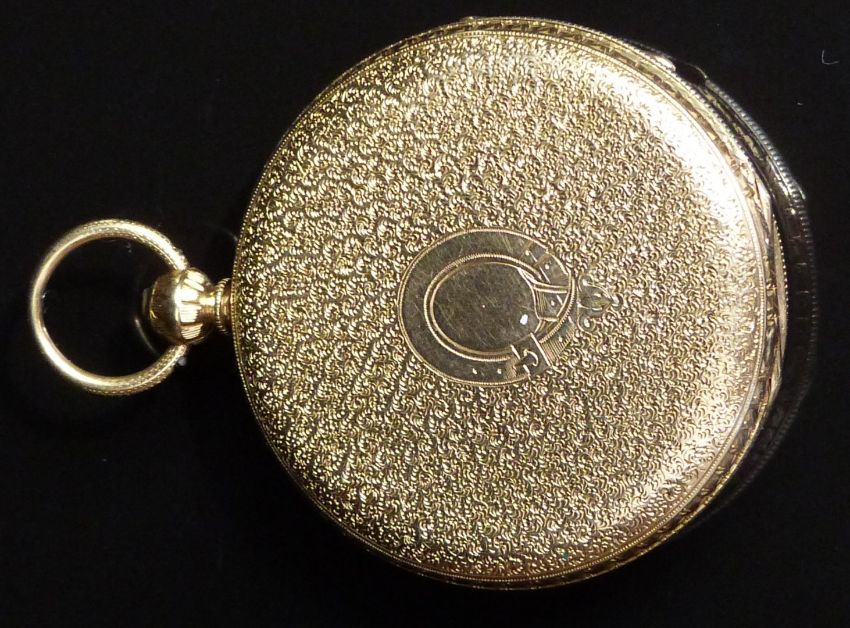 James H Hayes of Oldham 18ct gold open faced pocket watch with blued hands, black Roman numerals, engraved gold dial, ornately engraved case and signed movement, case diameter 41mm, serial number 54668, 51.7g