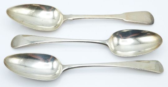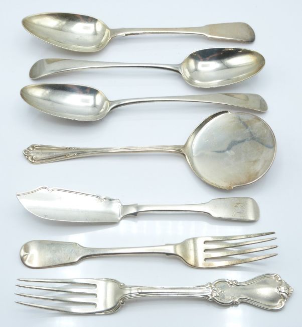 Georgian and Victorian flatware including three tablespoons, all London, makers WS, IL and IA, a butter knife, London 1833 by William Bateman II, a double struck fork, London maker John Le Gallais of St Helier Jersey, and a pastry server, 528g all in