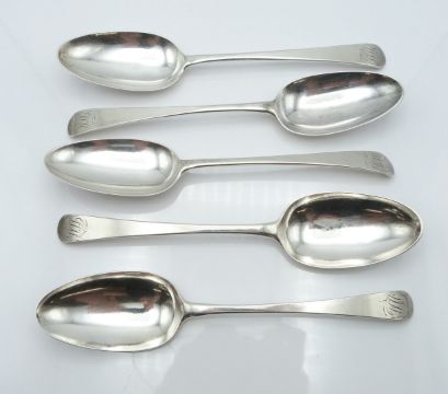 Georgian set of five bottom hallmarked silver table spoons, London 1774, maker Thomas Tookey, length 20.5cm, weight 273g
