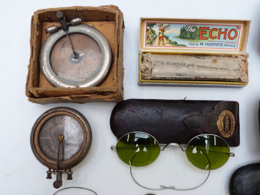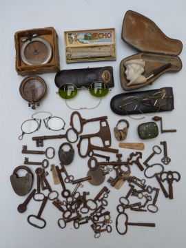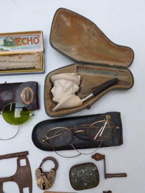 Vintage brass padlocks, 18th/19thC keys, watch keys, Duretta sound box for all Gramophones, Hohner Echo Super Vamper mouth organ by Hohner, vintage spectacles etc