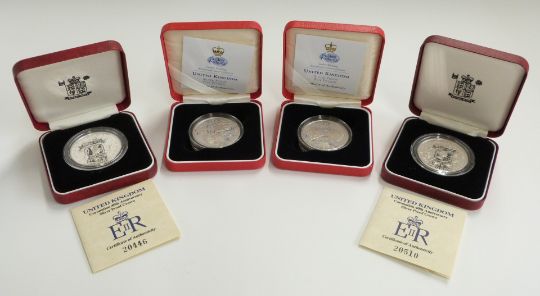 Four Royal Mint silver proof £5 coins, two for 1993 and two for 1997, all cased with certificates
