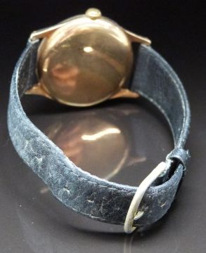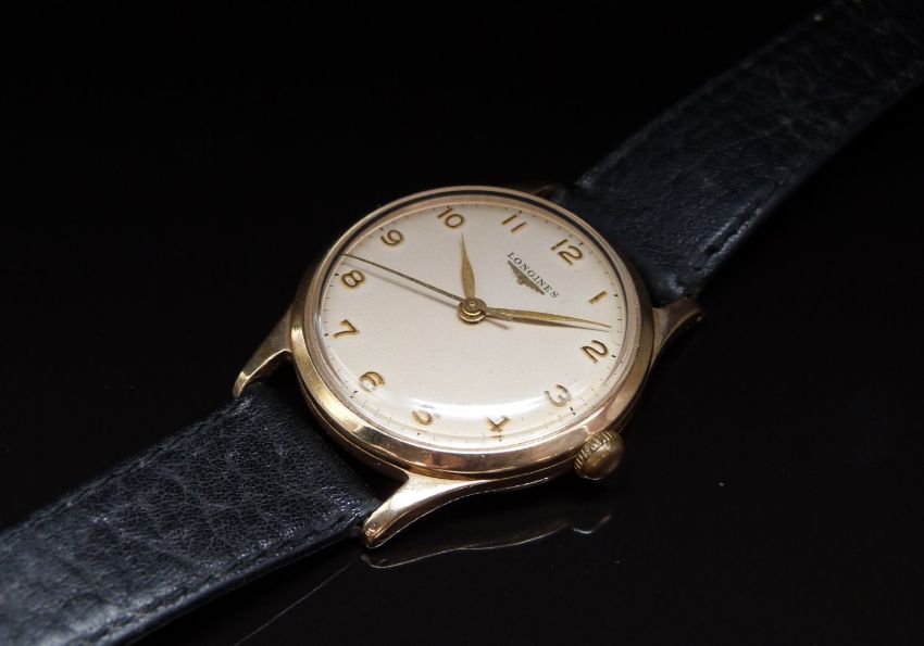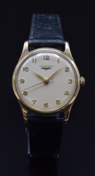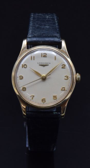 Longines 9ct gold gentleman's wristwatch ref. 13322 with gold hands and Arabic numerals, champagne dial, case stamped 'Baume' and signed 17 jewel calibre 30 LS movement, on black leather strap, case diameter 31mm, serial number 12503667