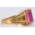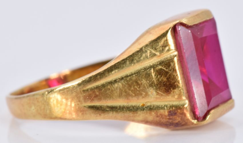 An 18ct gold ring set with an emerald cut synthetic ruby, 5.5g, size P