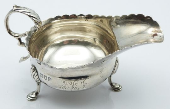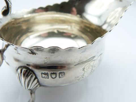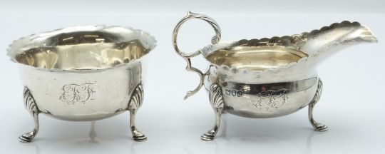Victorian hallmarked silver sauce boat and sugar bowl, both with wavy edge and raised on three feet, London 1897/8 maker Thomas Bradbury & Sons, length of sauce boat 11.5cm, weight 152g