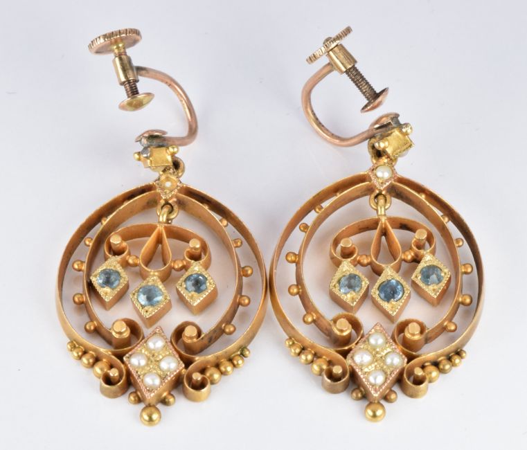 A pair of Victorian/ Edwardian earrings set with aquamarines and seed pearls, 4.5 x 4cm