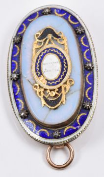 Georgian pendant/ brooch set with enamel reading Souvenir Damcie surrounded by further enamel and opalised glass with rose cut diamonds to the border, 1.5 x 3cm