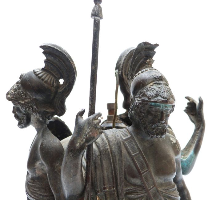 19thC or early 20thC figural lamp base formed of three Greek or Roman classical soldiers or centurions, height 38cm