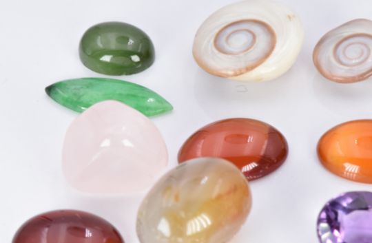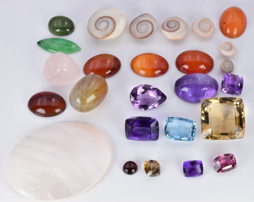 An aquamarine, jade cabochons, five amethysts, two citrines, garnets, agate, etc