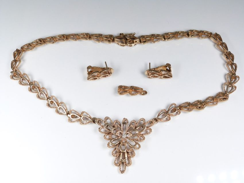 A 9ct gold necklace and earrings in a stylised floral design set with a diamond, 58g