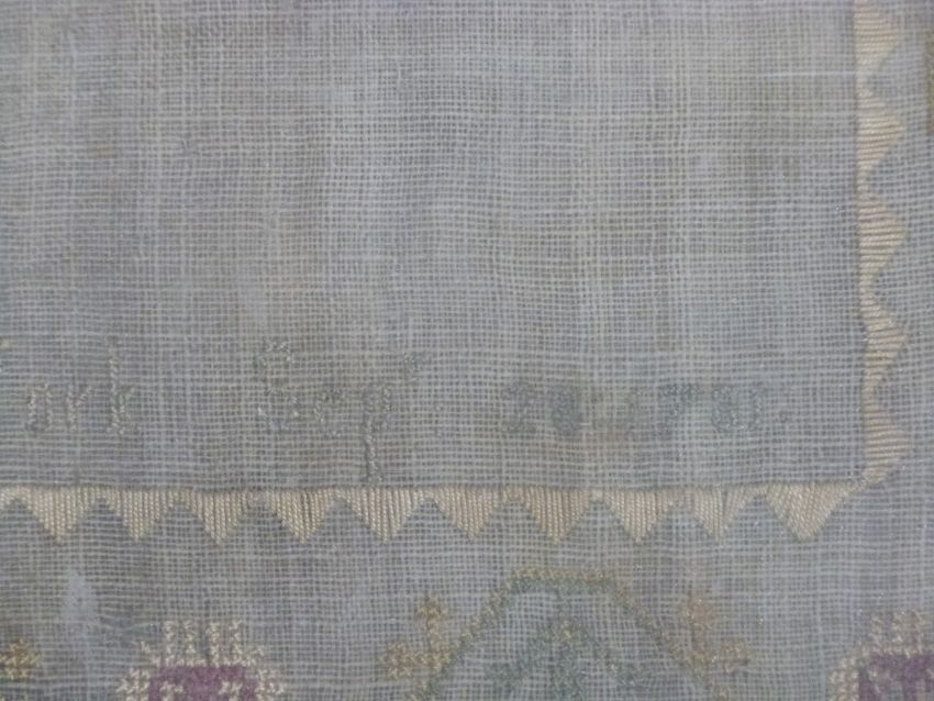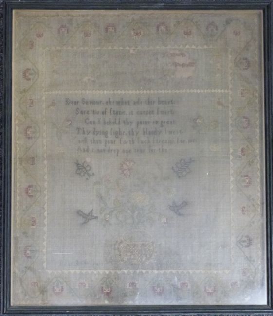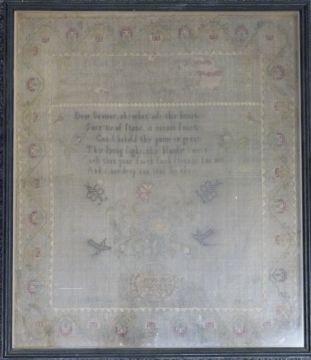 Georgian sampler by Marthe Norris 1781 with conservation card verso dated 1987, 38 x 32cm