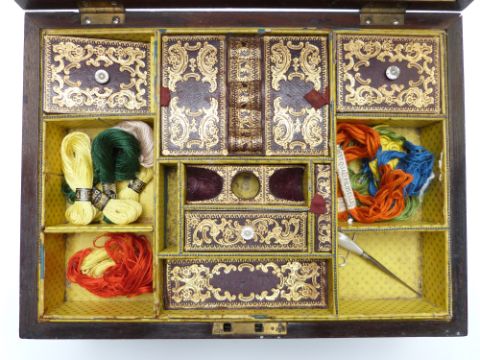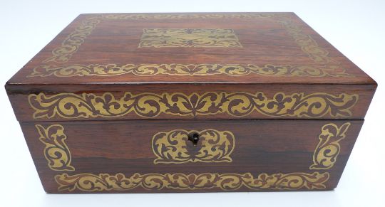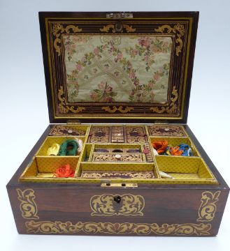 A 19thC brass inlaid rosewood workbox with fitted interior, gilt and tooled Morrocco leather covers, yarn and an Edwardian album of missives, verse, drawings etc, W33 x D22 x H15cm
