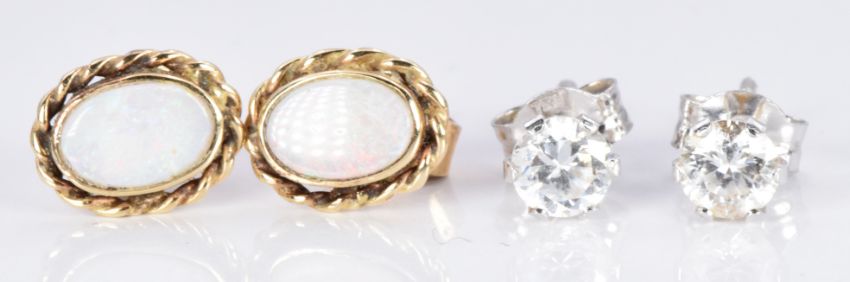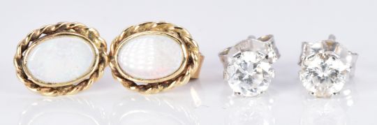 A pair of 18ct white gold earrings and a pair of 9ct gold earrings set with opals