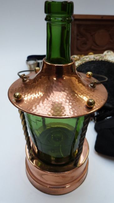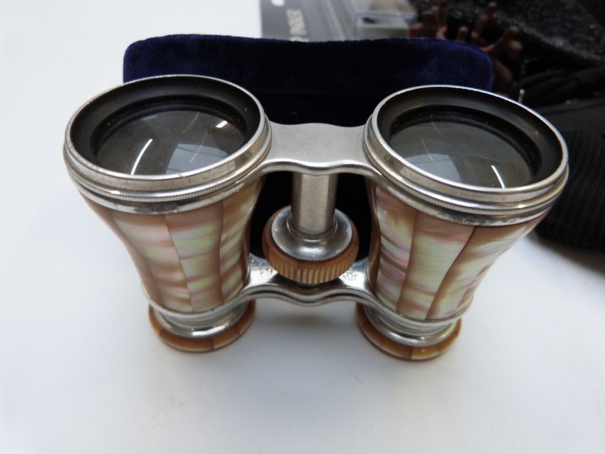 Oriental carved wood dragon box, filigree items, Lemaire opera glasses, buttons, Parker 15 pen, vintage bags including Art Deco style examples, cased barometer and thermometer