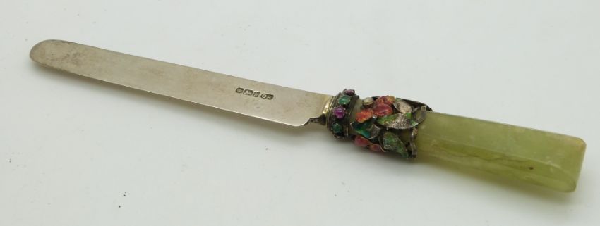 Pair of 19thC French jade handled knives set with enamel flowers with garnet and pearl centres with emerald and ruby cabochon collars, one with French silver gilt blade circa 1819-1838, the other a hallmarked silver blade Sheffield 1902, length 18.5cm