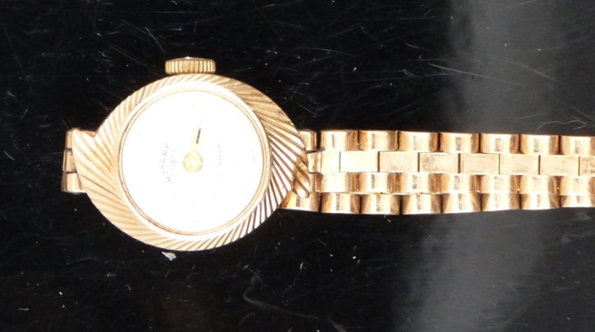 Rotary 9ct gold ladies wristwatch with gold hands and hour markers, silver dial and asymmetric case, on 9ct gold bracelet, case diameter 15mm, 14.9g