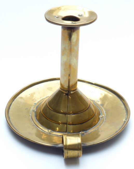 17thC riveted brass chamberstick of stepped form, height 17cm, diameter 20cm