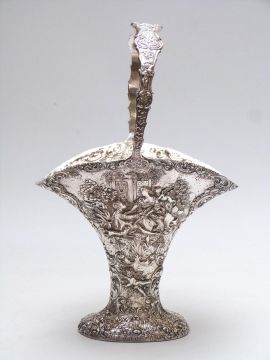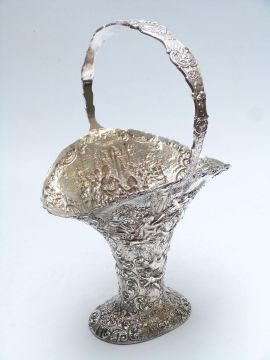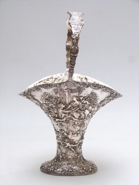 Silver plated basket, all over repoussé decoration of Watteau scenes, height 38cm
