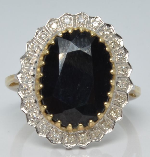 A 9ct gold ring set with a large oval sapphire surrounded by diamonds, 5.1g, size M/N