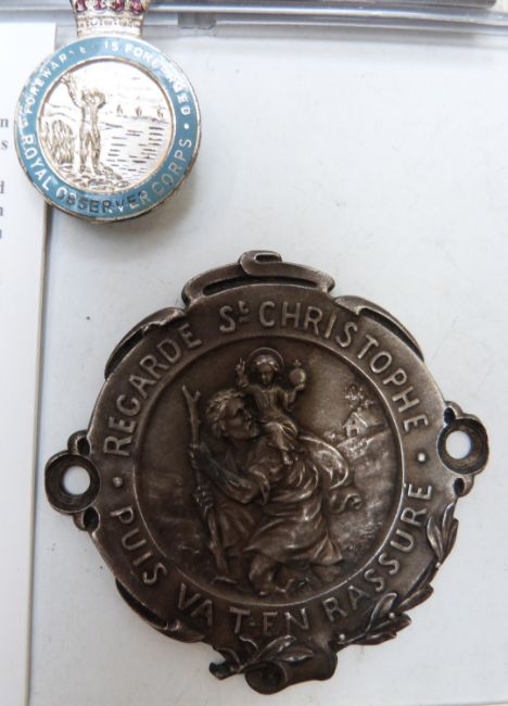 Royal Observer Corps lapel badge together with commemorative Royal Observer Corps stamp covers, dashboard St Christopher badge, D-Day and VE Day coins etc