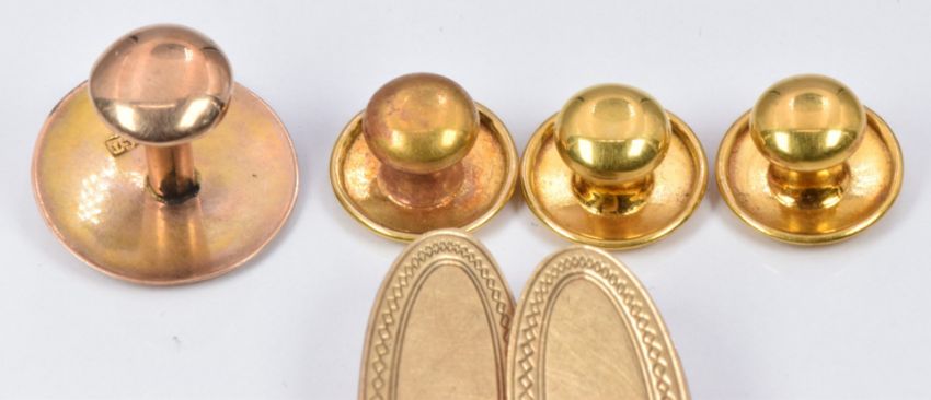 Four 9ct gold studs and a 9ct gold cufflink, 6.6g