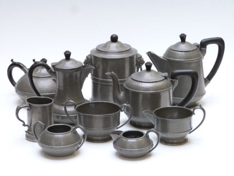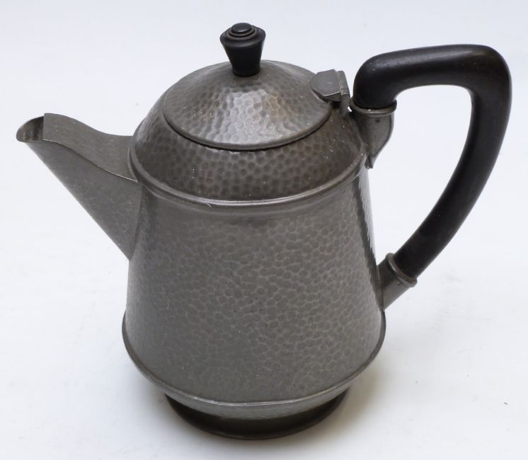 A collection of pewter teaware including some with hammered Arts and Crafts style decoration, height of tallest 20cm